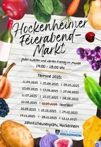 Egal ob Obst und Gemüse, Käse, Backwaren oder Wein – auf dem Hockenheimer Feierabendmarkt bieten zahlreiche regionale Anbieter ihr abwechslungsreiches Sortiment an. Der Hockenheimer Feierabendmarkt findet jeweils am zweiten und vierten Freitag des Monats auf dem Zehntscheunenplatz statt. Von 14:00 bis 18:00 Uhr kann hier eingekauft und geschlemmt werden. Der nächste Markt-Tag findet am 27. Juni 2025 statt.