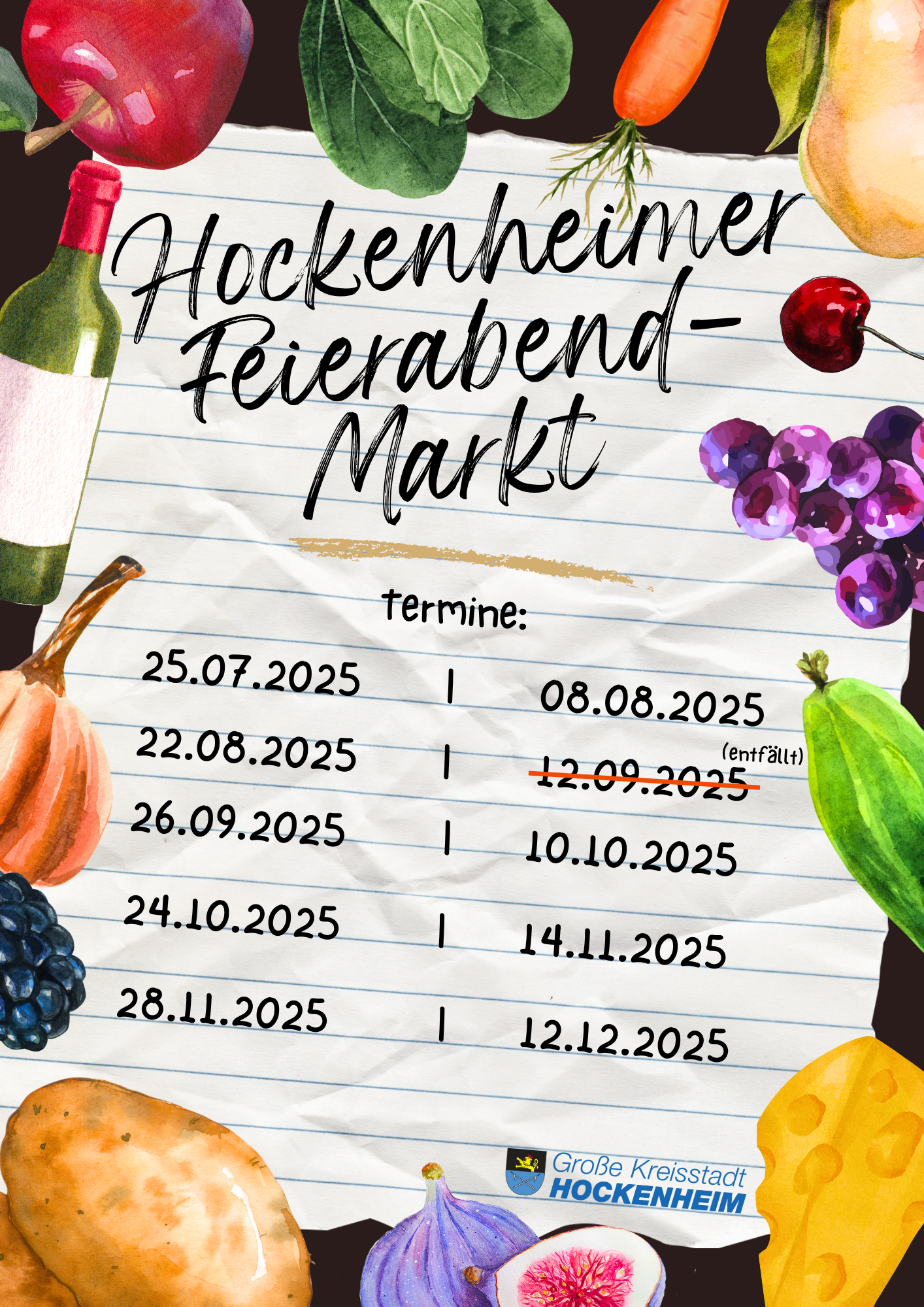 Egal ob Obst und Gemüse, Käse, Backwaren oder Wein – auf dem Hockenheimer Feierabendmarkt bieten zahlreiche regionale Anbieter ihr abwechslungsreiches Sortiment an. Der Hockenheimer Feierabendmarkt findet jeweils am zweiten und vierten Freitag des Monats auf dem Zehntscheunenplatz statt. Von 14:00 bis 18:00 Uhr kann hier eingekauft und geschlemmt werden. Der nächste Markt-Tag findet am 26. September 2025 statt.