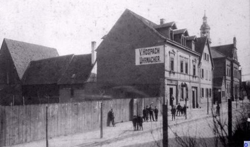 Schon zu Lebzeiten des Familienoberhauptes traten erhebliche Spannungen zwischen den Kindern aus 1. Ehe und der Stiefmutter auf. Nicht überraschend kam es daher nach dem Tod von Johann Adam am 26.04.1875 zu erbitterten Erbstreitigkeiten, was letztlich dazu führte, dass das hier beschriebene Anwesen Obere Hauptstr. 5 im Oktober 1875 versteigert werden musste. Erwerber war vermutlich ein Hockenheimer mit Namen Weißenberger, der es vermutlich an seinen ältesten Sohn, den Jakob Weißenberger übergab und gleichzeitig zu Gunsten seiner weiteren Kinder, nämlich Elisabetha Walter und Johann Weißenberger Gleichstellungsgelder ins Grundbuch eintragen ließ. Der neue Eigentümer heiratete offensichtlich eine Frau aus Erzingen und verzog dorthin. Der Eigentümer, inzwischen „verwitweter Landwirt“, verkaufte das Anwesen (damals noch Nr. 6), im Oktober 1897 „an Victorin Hospach, verheirateter Uhrenmacher, wohnhaft dahier“ und zahlte aus dem Verkaufserlös von 20.000 Mark seine Geschwister aus. Der Kaufpreis beinhaltete das Grundstück von damals 7,66 Ar samt „zweistöckigem Wohnhaus mit überbauter Einfahrt und gewölbtem Keller, massivem Sockel, Schopf mit Schweineställen, eine Scheuer mit Stall und Barren, Werkstadt mit Backhaus mit Balkenkeller“. Hospach, geboren im Jahr 1867 in Vehringenstadt bei Sigmaringen, war verheiratet mit der Hockenheimerin Maria Magdalene geb. Gelb. Im Grundbuch eingetragen wurde das Eigentum für „das Gesamtgut der Fahrnisgemeinschaft“ zwischen den Eheleuten Hospach. Kurz nach der Übernahme ließen die Hospachs das alte Wohnhaus abreißen und ersetzten es durch ein stattliches zweistöckiges Gebäude samt Dachgeschoß mit drei Gauben und versehen mit damals typischen Jugendstilelementen (Gründerzeit). Vermutlich war das alte Haus beim Brand des Nachbargebäudes Nr. 4 („Schwarzes Lamm“) am 27.02.1900 in Mitleidenschaft gezogen worden und eine grundlegende Renovierung, verbunden mit der Umgestaltung des Erdgeschosses in ein Ladenlokal mit Werkstatt wäre auch nicht viel billiger gewesen. Das erste Uhrmacher-Fachgeschäft der Region wurde dort jahrzehntelang betrieben.