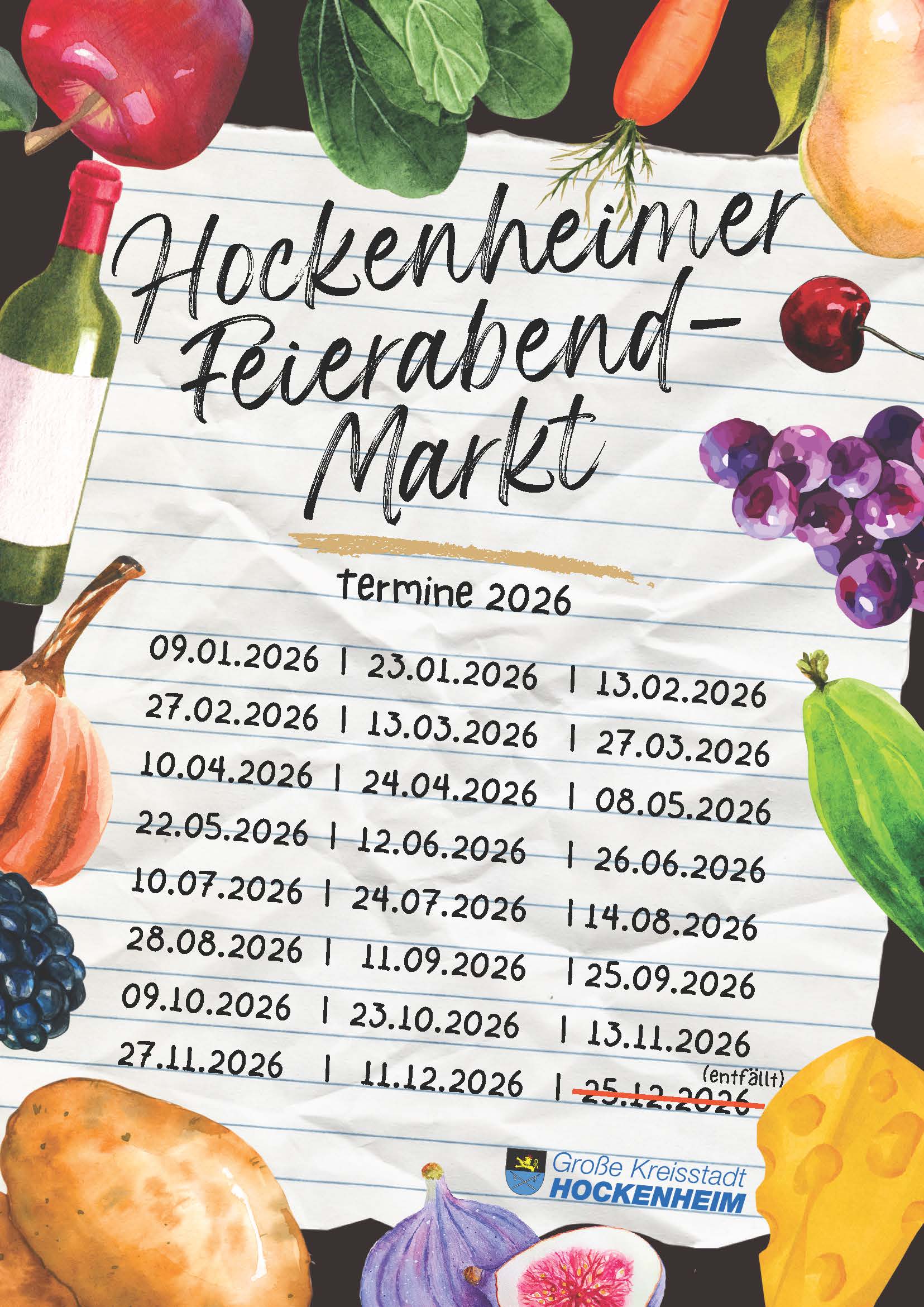 Egal ob Obst und Gemüse, Käse, Backwaren oder Wein – auf dem Hockenheimer Feierabendmarkt bieten zahlreiche regionale Anbieter ihr abwechslungsreiches Sortiment an. Der Hockenheimer Feierabendmarkt findet jeweils am zweiten und vierten Freitag des Monats auf dem Zehntscheunenplatz statt. Von 14:00 bis 18:00 Uhr kann hier eingekauft und geschlemmt werden. Der nächste Markt-Tag findet am 27. Februar 2026 statt.