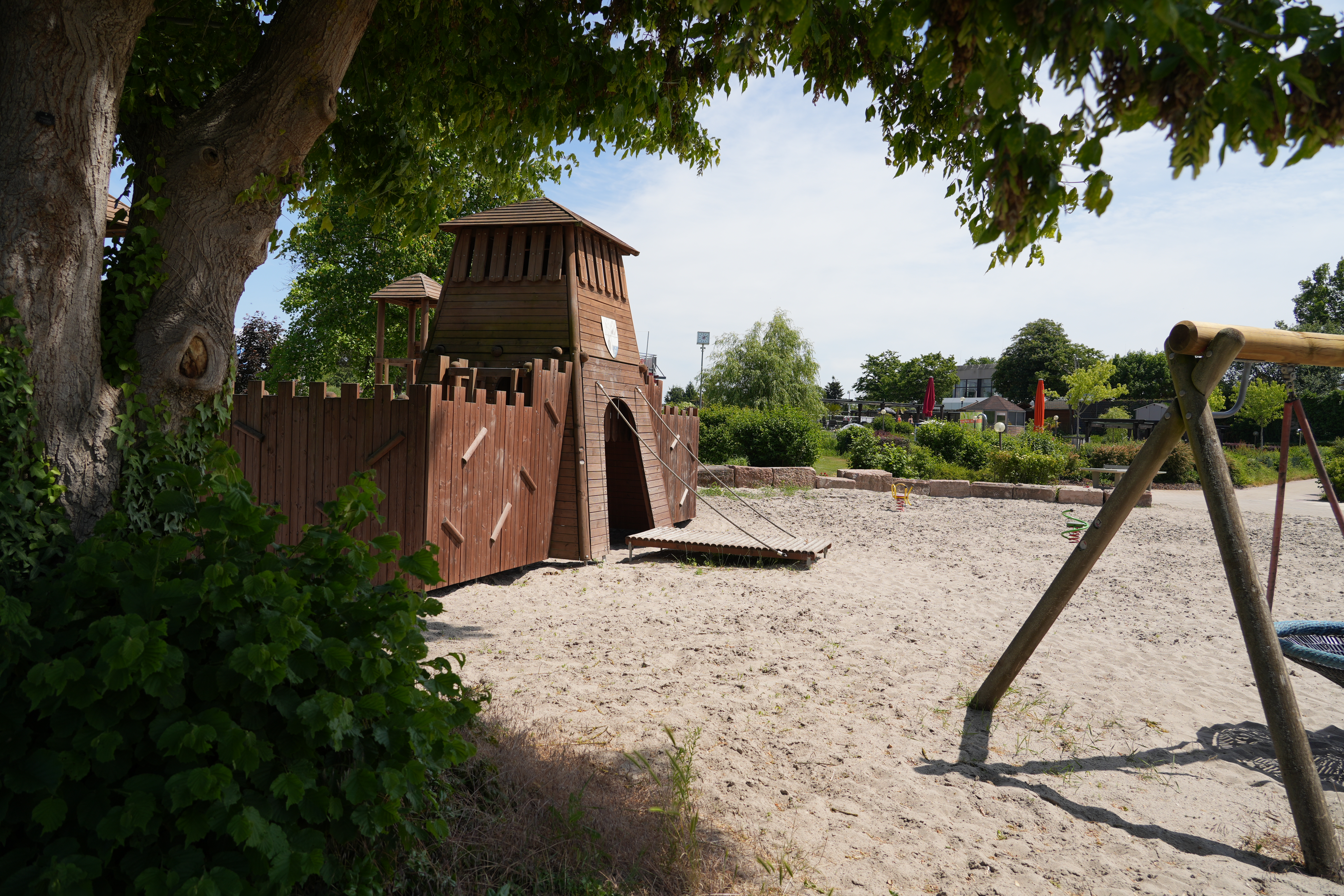 Auch auf dem Trockenen bietet das Freibad seinen Gästen abwechslungsreiche Möglichkeiten. Die große Liegewiese bietet ausreichend Schatten- und Sonnenplätze, um sich zu entspannen. Ein großer Spielplatz mit verschiedenen Spielgeräten sowie einer hölzernen Ritterburg lässt Kinderherzen höherschlagen und bietet Raum für viel Fantasie und Spielspaß. Ein Beachvolleyballfeld lädt Hobbysportlerinnen und Hobbysportler zu kleinen und großen Volleyballpartien ein. Abgerundet wird das Angebot des Freizeitbades mit Snack und Getränkeangeboten.