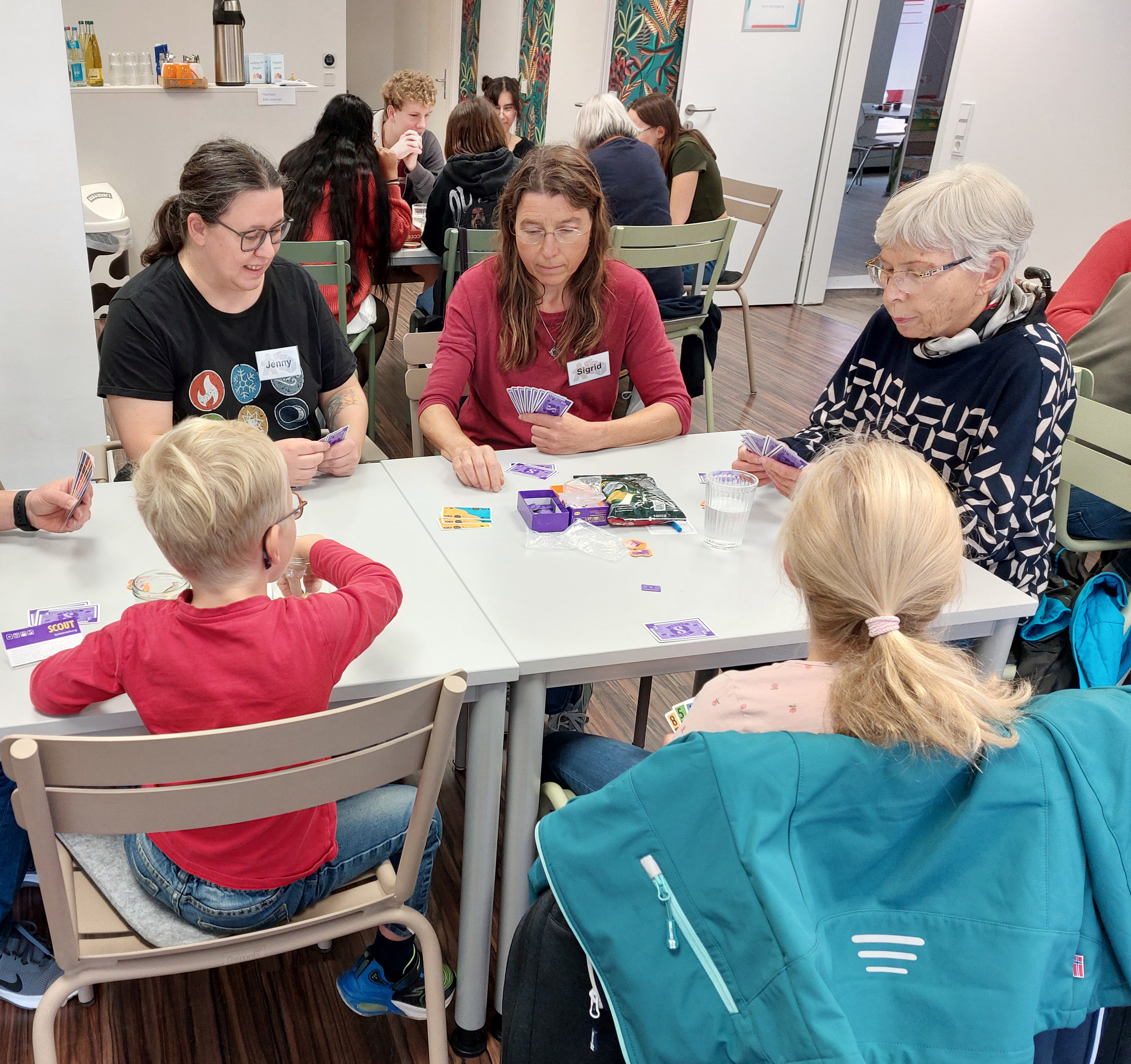 Ein einfacher Aufsteller mit der Aufschrift „Mitspieler gesucht“ ermöglichte auch Neuankömmlingen spontane Spielrunden. Die ehrenamtlichen Initiatoren des Brettspieltreffs, Jenny Rausch und Andi Hellmund, zeigten sich begeistert vom großen Zuspruch ihrer Veranstaltungsidee. Rund 50 Gäste besuchten die flexibel genutzten Räume des Hoggema Treffs, die sich als hervorragend geeignet für diese Art von Event herausstellten. Dank der räumlichen Flexibilität konnte bei Platzmangel schnell die Tür zum angrenzenden Sprachkursraum geöffnet werden, wodurch zusätzliche Spieltische aufgestellt werden konnten.