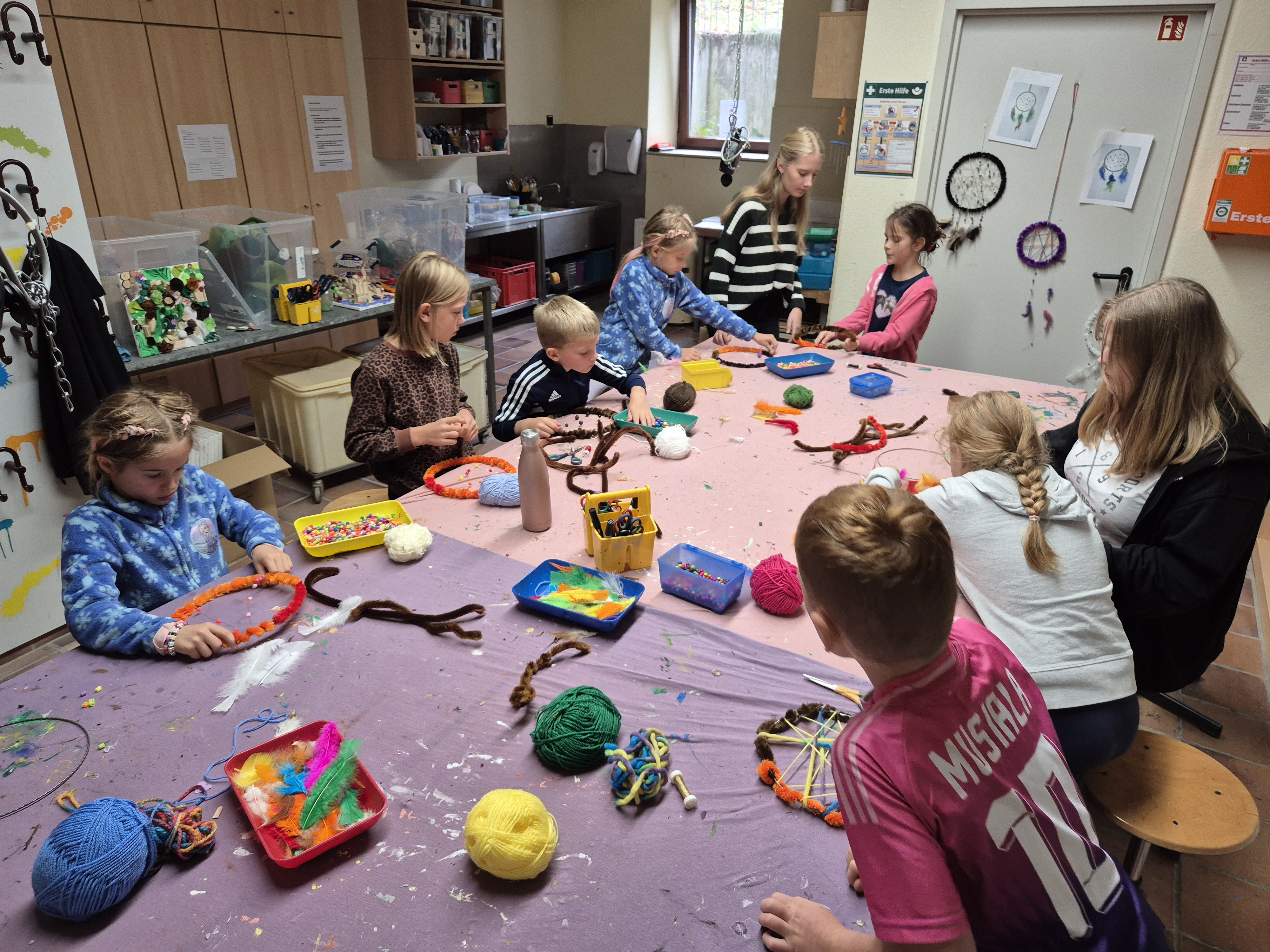 In der ersten und der letzten Ferienwochen fand Parallelprogramm im Wald und im Pumpwerk statt, eine Gruppe erkundete das Grüne, die andere blieb im Pumpwerk – zur Mitte der Woche wurde getauscht. Die Pumpwerk-Kids konnten mit dem Betreuerteam rund um Dual-Studentin Kim Feuerstein ihre Räubersinne beim Tast- und Hörspiel testen, tauchten beim Vorlesen in verschiedene Räubergeschichten ein und konnten draußen beim Schatzsuchen nach echten Edelsteinen suchen und diese aus dem Sand herauswaschen – ein echter Räuber braucht ja auch schließlich Beute. In der Werkstatt des Pumpwerks entstanden außerdem kreative Traumfänger, die die kleinen Räuberinnen und Räuber zu Hause über ihr Bett hängen können.