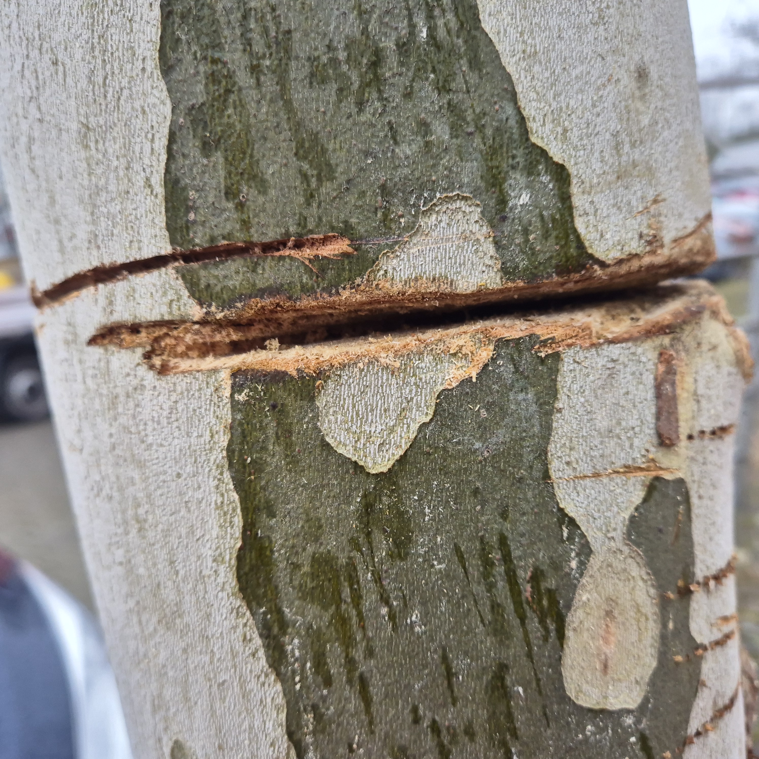 Am Bahnhofsparkplatz wurde vor Kurzem eine Platane schwer beschädigt. Mithilfe einer Säge wurde der Baum in circa 1,5 Metern Höhe einmal rundherum angesägt. Aufgrund der Tiefe des Schnitts von circa zwei bis fünf Zentimetern wurden die Versorgungbahnen des Baumes durchtrennt. Ohne intakte Versorgungsleitungen ist ein Baum nicht lebensfähig und stirbt über Kurz oder Lang ab. Auf Grund der Tiefe des Einschnitts und der leichten Schiefstellung des Baumes war zu erwarten, dass bei Windbelastung der Schnitt weiter einreißen würde und es somit zu einem unkontrollierten abbrechen der Krone samt Stammstück kommen könnte. Da dies die Sicherheit von Passanten und Fahrzeugen enorm gefährdet hätte, wurde der schwer beschädigte Baum von Mitarbeitenden des Hockenheimer Bauhofs fachgerecht gefällt. Insgesamt ist durch das Ansägen des Baumes ein Schaden von über 5.000 Euro entstanden.