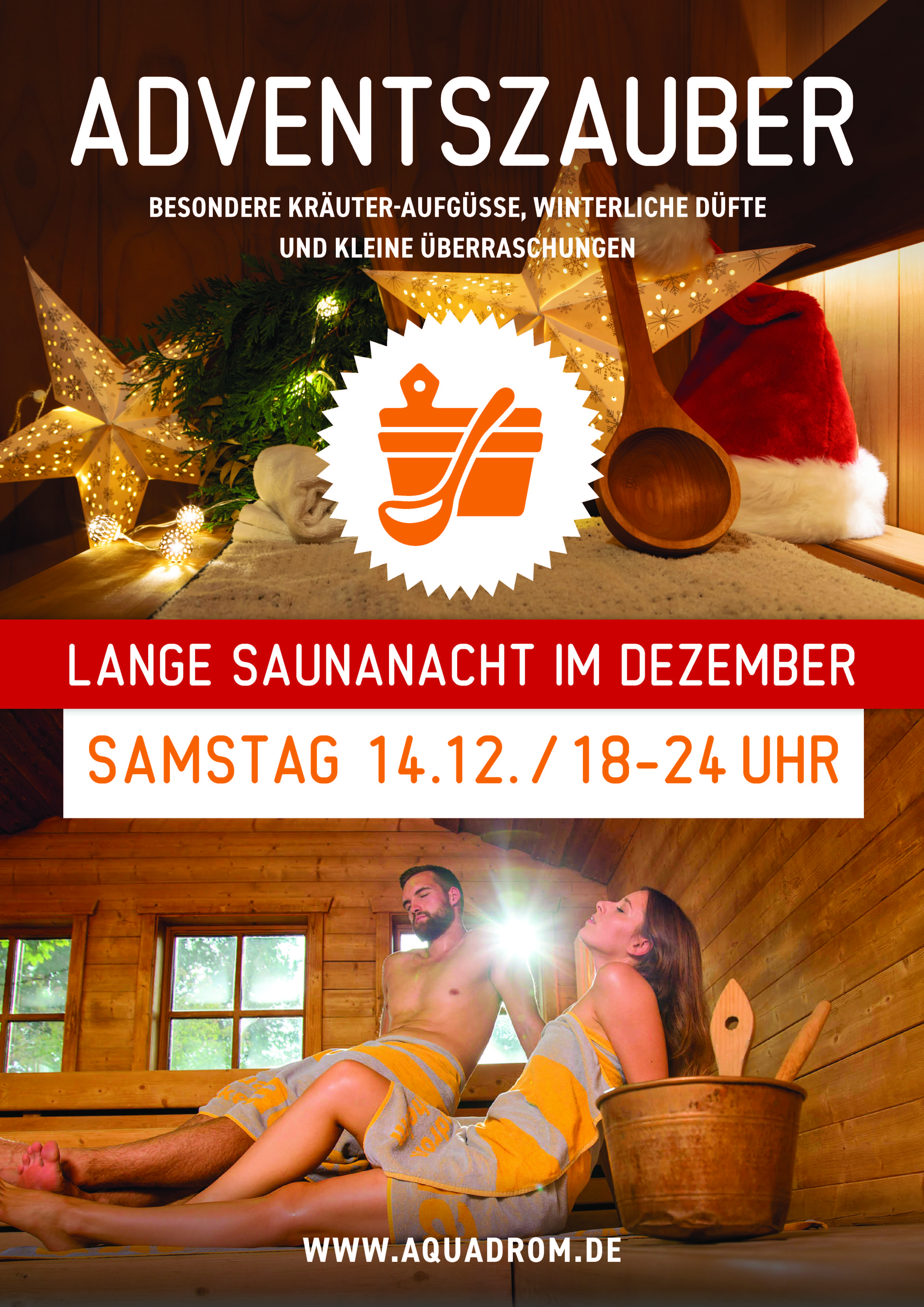 Bei einer langen Saunanacht erwartet die Gäste am Samstag, den 14. Dezember 2024, ein Abend voller besonderer Kräuteraufgüsse, winterlicher Düfte, kleiner Überraschungen und viel Adventszauber. Damit die Saunagäste den Abend in vollen Zügen genießen können, bleibt die Saunalandschaft an diesem Tag bis 24:00 Uhr geöffnet.