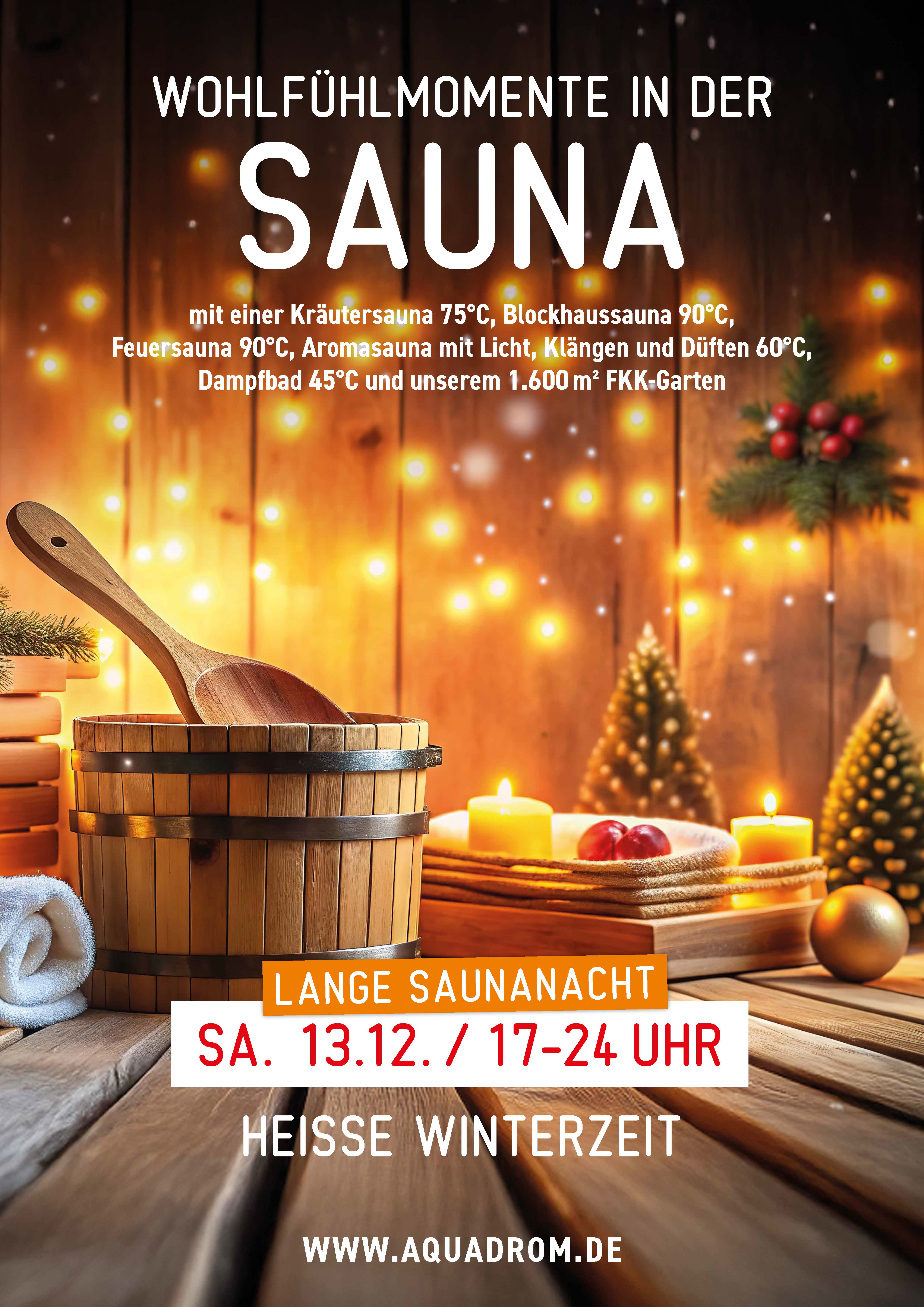 Für eine Extra-Portion Erholung vom vorweihnachtlichen Stress lädt das Aquadrom zu einer langen Winter-Saunanacht ein. Am Samstag, den 13. Dezember 2025, erwartet die Gäste ein Abend voller besonderer Kräuteraufgüsse, winterlicher Düfte und kleiner Überraschungen. Damit die Saunagäste den Abend in vollen Zügen genießen können, bleibt die Saunalandschaft an diesem Tag bis 24:00 Uhr geöffnet. Das eigentliche Winter-Spezial beginnt ab 17:00 Uhr. Verschiedene Leckereien, stimmungsvolle Dekoration und ein auf das Motto abgestimmtes Gastro-Angebot runden die vorweihnachtliche Entspannung ab. Ab 21:00 Uhr, nachdem alle Badegäste das Hallenbad verlassen haben, dürfen die Saunagäste auch das gesamte Hallenbad textilfrei nutzen, um sich abzukühlen.